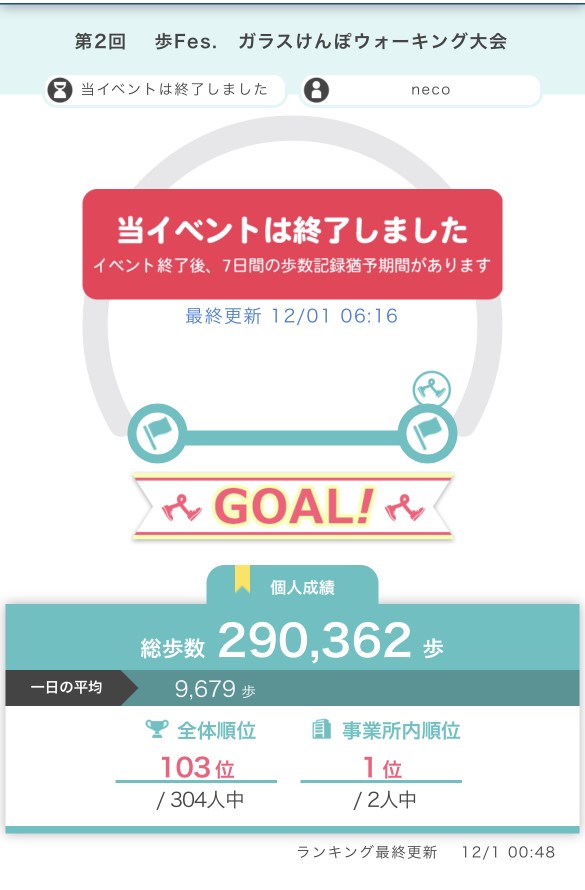 残念ながら、上位入賞にはかすりもしませんでしたが、何とか平均歩数9,000歩は達成しました。🙌