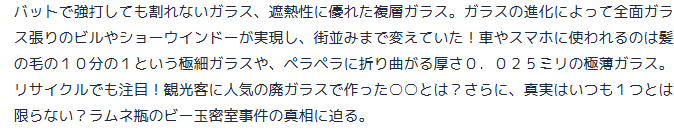 10月19日(日)18時05分より放送される、NHK総合テレビ「有吉のお金発見 突撃!カネオくん」において、【ガラス】が取り上げられます。